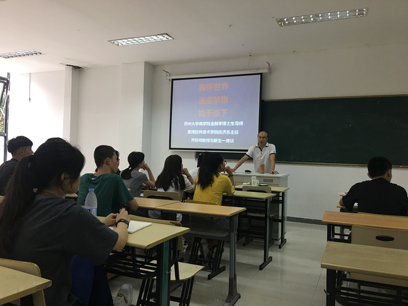 经济系系主任、特聘教授乔桂明教授以“胸怀天下,追逐梦想,始于当下”为题给新生们进行了一场热血彭拜的专题讲座。乔教授结合当下国际形势,点明同学们身上所肩负的责任,通过中外案例和职业种类分别从奋斗目标和专业前景等方面向学生做了详细的介绍。新生代表周智梁和兰廷坤进行了专业学习情况分享。