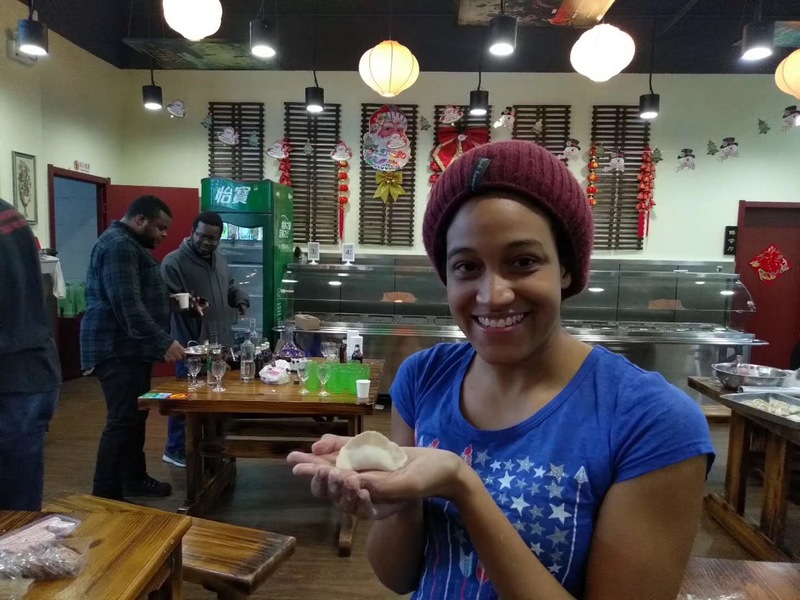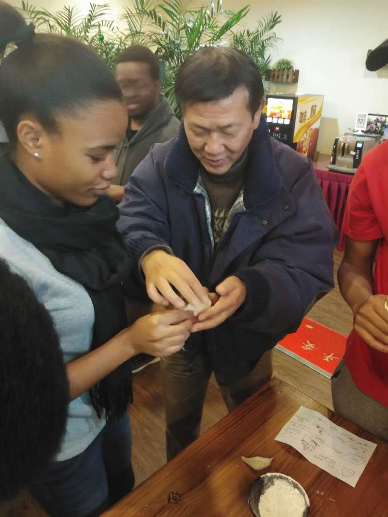卢处帮助留学生捏饺子边