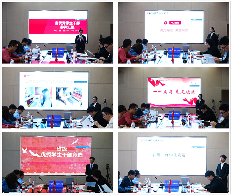 为营造良好育人氛围,进一步推动校风、学风、班风建设,树立先进典型,发挥典型的示范和引领作用,激励广大同学积极进取、争创先进。4月11日下午,学校在行政楼会议室开展省级三好学生、优秀学生干部、优秀毕业生和先进班集体的竞选活动。学生处处长邹艳星,校团委副书记程前,学生处刘红妹老师及各二级学院学工负责人担任本次评委。校团委书记王鑫主持,各二级学院分团委老师观摩了此次活动。