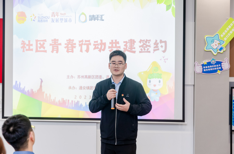 苏州高新区团委副书记陈峰在活动上致辞。他表示,高校与社区共建,可以资源共享,优势互补,共同提高学生的综合能力素质,同时为基层注入新动能与新活力。他希望通过本次共建签约,通安镇团委和学校机电工程学院团委能充分整合阵地资源为青年所用,提供学习、健身、休闲、社交、志愿服务、亲子互动等各类服务活动,面面俱到,样样俱全。