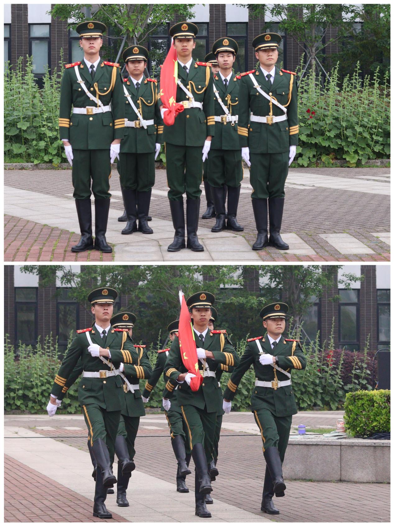国旗班迈着整齐划一、铿锵有力的步伐,护送五星红旗正步走向旗杆。伴随着激昂的国歌响起,全体师生齐唱国歌,注视着五星红旗冉冉升起,在熠熠晨光中迎风飘扬。