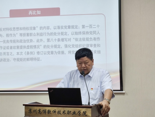 本次学习活动围绕“《条例》修订主要内容及其鲜明特征”、“新修订的《条例》对于推进全面从严治党向纵深发展的重要意义”、“抓好新修订《条例》贯彻执行”三部分进行展开。廖振强书记围绕《条例》的修订概况和主要内容进行了全面解读,并结合典型案例,以案促学、以案明纪,使党员受警醒、明底线、知敬畏,坚决把纪律挺在前面,在思想上永葆先进。他强调,《条例》对于推进全面从严治党向纵深发展具有重要意义,它为新时代新征程推进全面从严治党提供坚强纪律保障,使全面从严治党的思路举措更加科学、更加严密、更加有效。